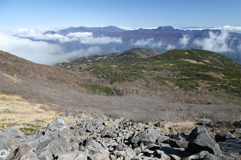 Thanks to the high atmospheric pressure, we had the clear sky. After the pressure pattern changes into that of winter, the skiing and snowboarding season will come. The blue sky, green Siberian pine trees and gray rocks…, the summit area of Mt. Hakuba Norikura showed me its simple colored beauty.